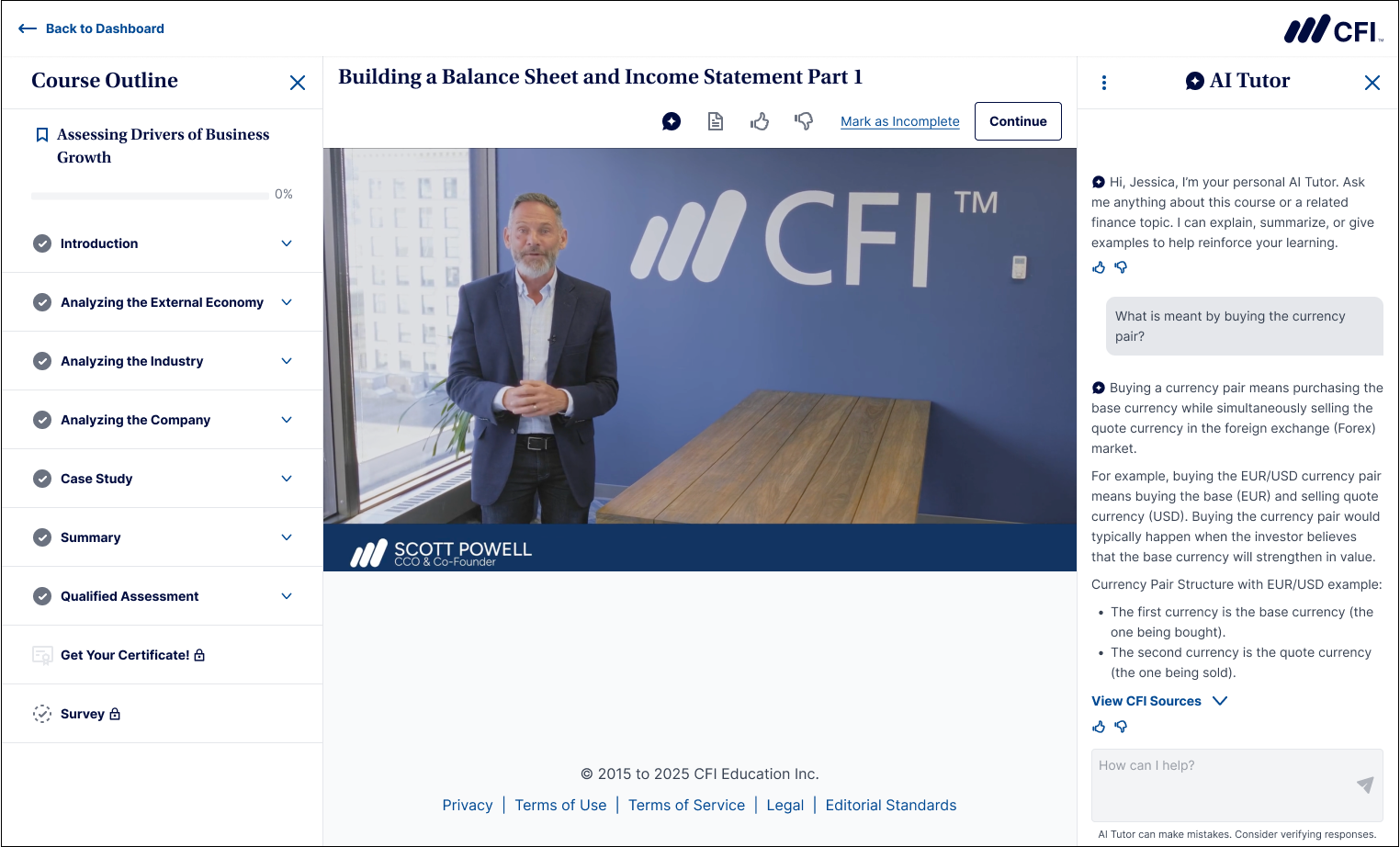 Accessible in both the course player and the header navigation, AI Tutor combines ChatGPT’s advanced AI chat functionality with your learning and career data, CFI’s course transcripts, and our catalog of finance resources. All of which provides you with an immersive and interactive learning experience tailored to your role and your learning journey.