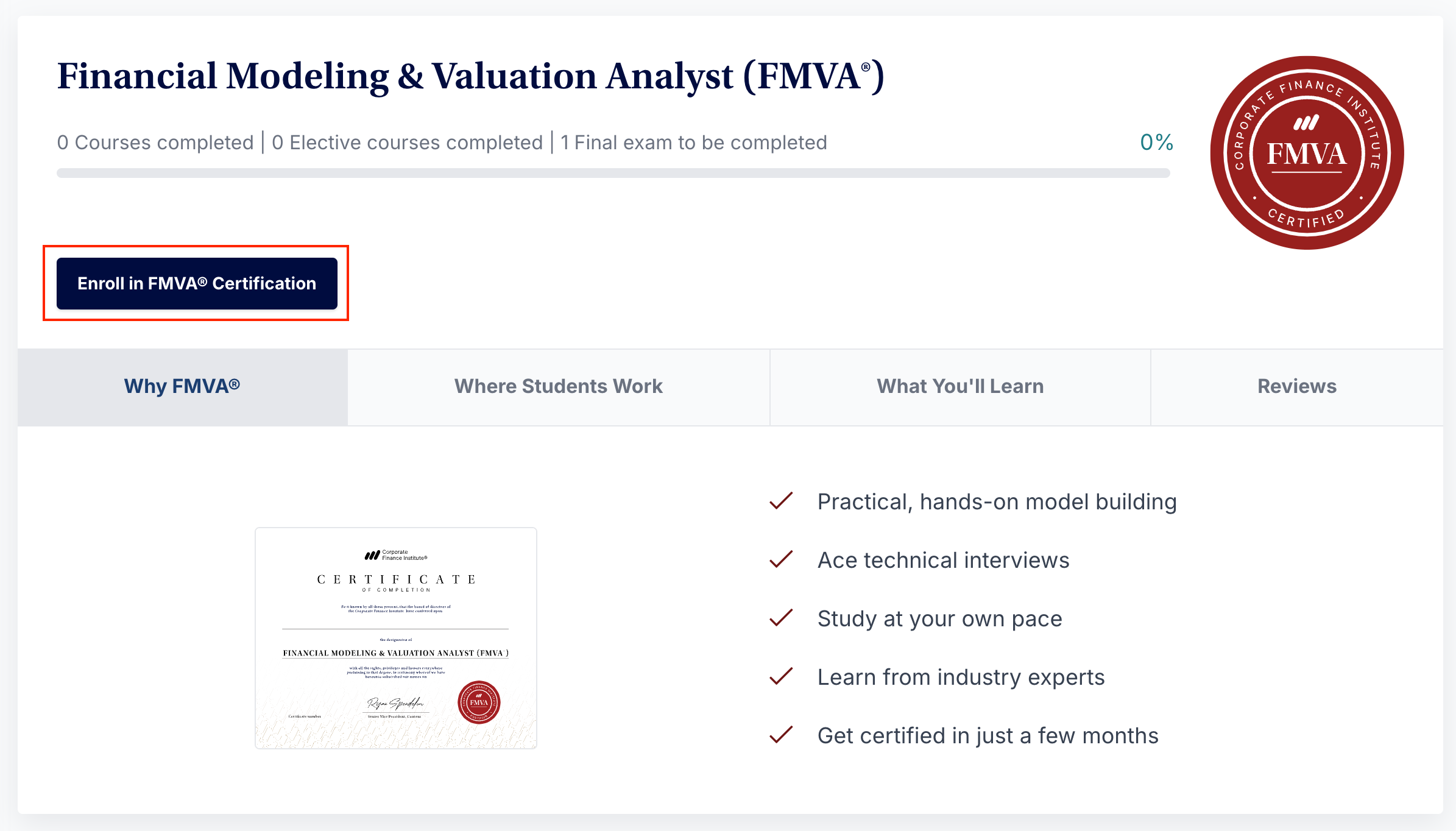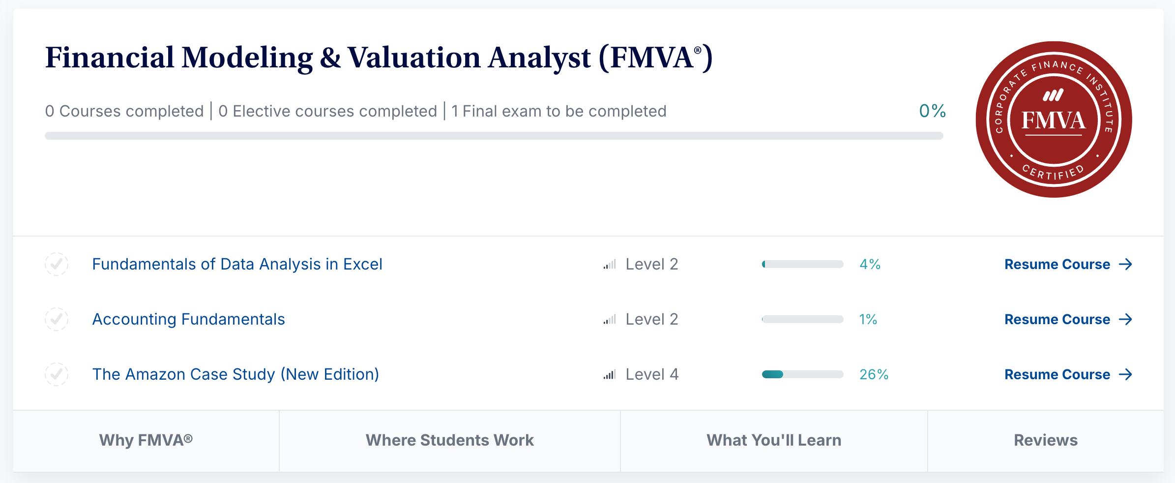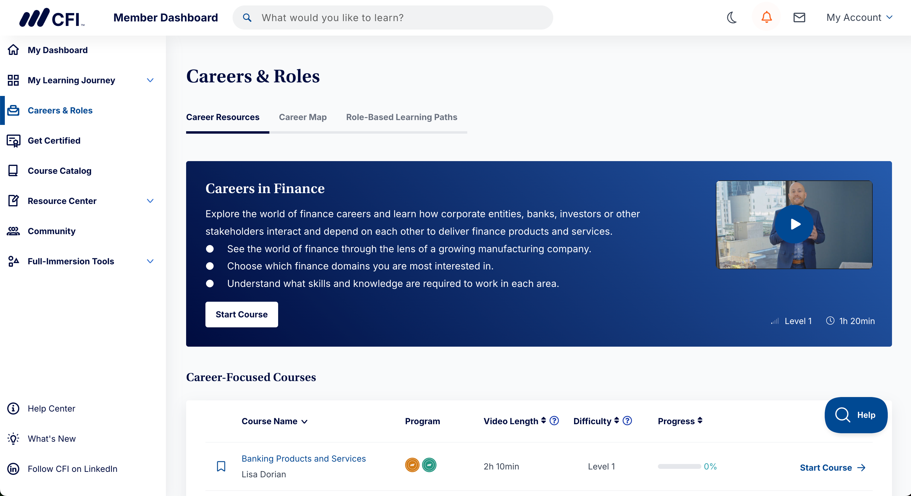 Career Resources are now available on your CFI dashboard. Start a career-focused course, such as the new Careers in Finance course, and explore recommended resources to help you progress in your career.
